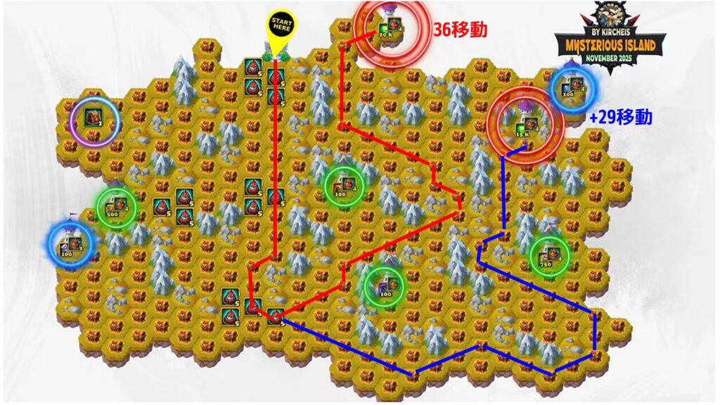スタート地点から中央上部の20Kエメラルド目標まで、36移動(赤経路)で到達できます。