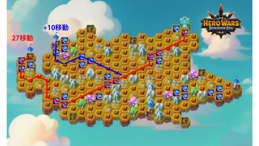 スタート地点から左中の目標まで、27移動(赤経路)で到達できます。