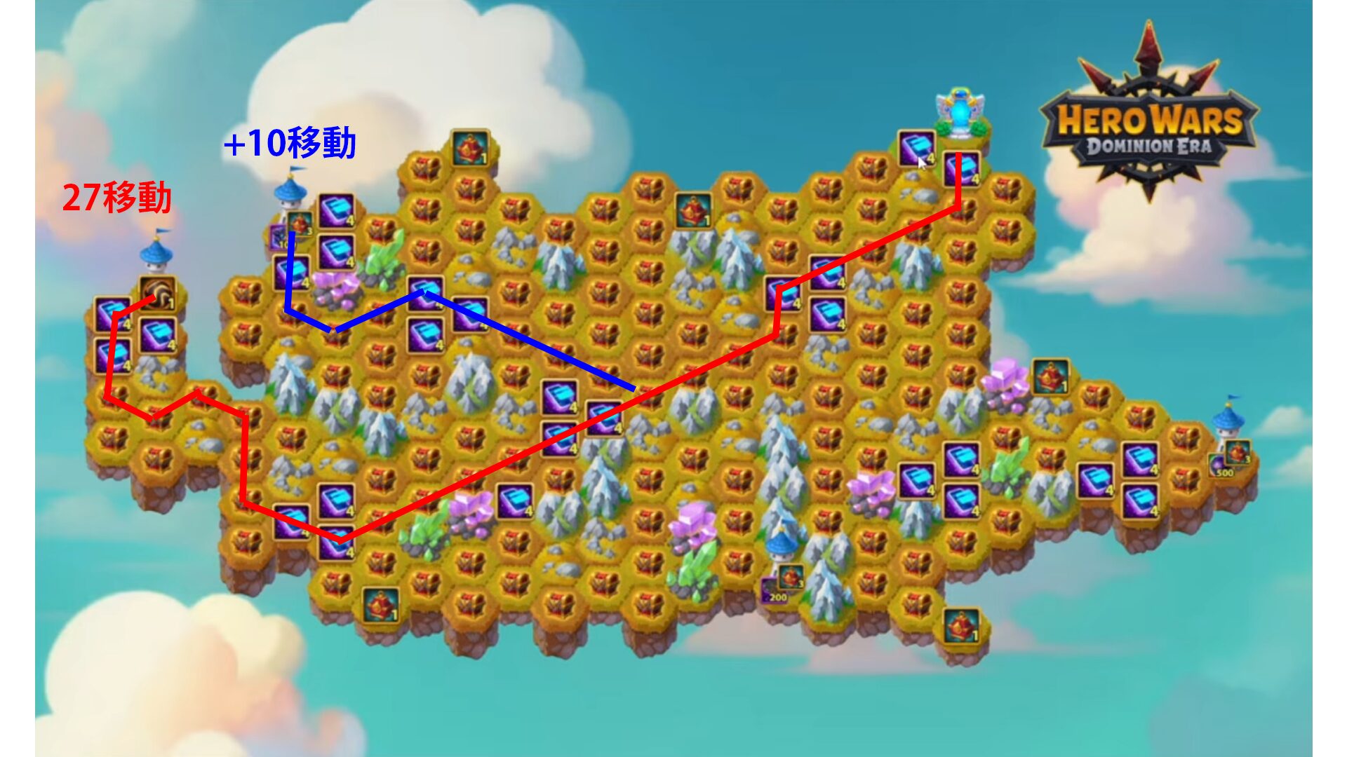 左上の第2目標まで、図のとおり+10移動(青経路)で到達できます。